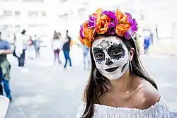 Die symbolträchtige Darstellung des Todes ist eng mit dem mexikanischen Feiertag Día de Muertos (Tag der Toten) verbunden, bei dem Verstorbene geehrt und gefeiert werden.[1] Während der Feierlichkeiten schmücken sich viele Menschen mit kunstvoller Gesichtsbemalung in Form stilisierter Totenschädel (calaveras). Diese Darstellungen gelten nicht als gruselig, sondern als festlich und lebensbejahend. Sie symbolisieren die Akzeptanz des Todes als Teil des Lebenskreislaufs und dienen dazu, den Verstorbenen Respekt zu zollen. Das Make-up wird dabei als eine Art Willkommensgruß verstanden, mit dem die Seelen der Toten am Fest teilhaben können. Gemäß der mexikanischen Tradition wird davon ausgegangen, dass die Grenze zwischen der Welt der Lebenden und der Toten an diesen Tagen durchlässig ist.[2]