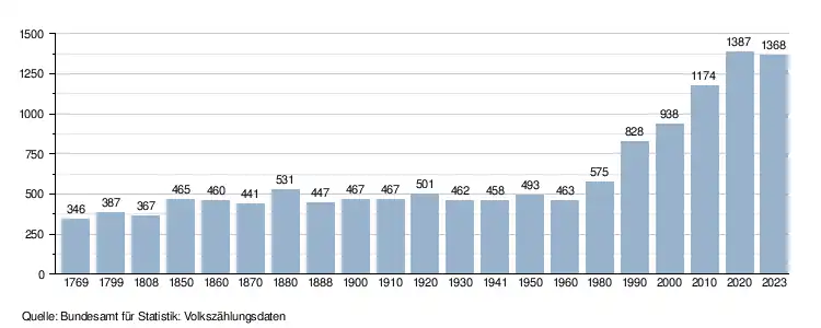 - ↑ Daten der Eidgenössischen Volkszählungen ab 1850 nach Gemeinden. (XLSX; 10 MB) Bundesamt für Statistik, Neuchâtel, 12. Juli 2024, abgerufen am 2. Februar 2025 (Öffnung in Excel nur über "Anhang/Excel-Datensatz" möglich).