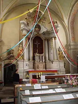 Im Hochaltar von 1780 aus der Werkstatt von Christian Bernhard Schmidt aus Rößel (polnisch Reszel) befindet sich noch das 1713 geschändete Kruzifix.