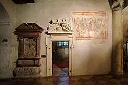 In der Turmkapelle mit einem Kreuzgewölbe aus dem 13. Jahrhundert befinden sich Wandmalereien um 1300 und um 1325. Der Eingang zur Turmkapelle ist mit einem Giebelschmuck ausgestattet, der mit 1643 datiert ist. Rechts vom Portal befindet sich eine Wandmalerei, die den hl. Michael als Seelenwäger zwischen Maria mit dem Kind als Fürsprecherin und Satan als Ankläger darstellt und um 1350 entstand.[3]