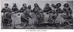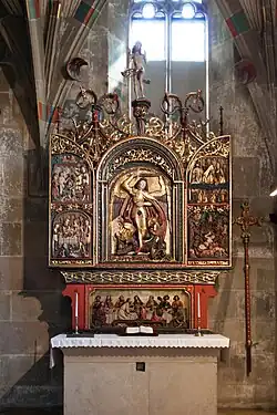 Das Altarretabel befindet sich heute in der Sakristei, stand aber früher in der mittleren (östlichen) Chorkapelle. Im Schrein ist eine geschnitzte Figurengruppe des heiligen Michael in goldener Rüstung, der das Schwert über den Drachen hält. Die Innenseiten der Flügel zeigen Halbreliefs, so oben links: Barmherzigkeit gegen Arme und Leidenden, unten links: der reiche Mann und der arme Lazarus. Rechts oben: das Weltgericht, unten rechts: die Hölle. Die Arbeit stammt aus der Werkstatt Hans Beuschers. Die Predella zeigt das Letzte Abendmahl.
