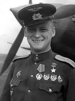 Seine Kriegsverwendung beendete er im Range eines Garde-Majors (der Flieger) mit insgesamt 215 Feindflügen. In diese Zeit gelangen ihm 14 Abschüsse im Luftkampf gegen feindliche Kampfflugzeuge, was für einen Bomberpiloten der sowjetischen Luftstreitkräfte bis dato als unübertroffen galt. Hierfür wurde er mit der höchsten Auszeichnung des Landes „Held der Sowjetunion“ zweifach geehrt. Ausführliche Darstellungen dazu enthält der zusammenfassende Einsatz-Rapport seines damaligen Geschwaderkommandeurs Garde-Oberstleutnant und Held der Sowjetunion Grigori Tschernezow, 155. Garde-Schlachtfliegerregiment, vom 8. Juni 1945, der im Original vorliegt. Seine besonderen Leistungen wurden zudem mehrfach durch verschiedene Befehlshaber der Land- und Luftstreitkräfte im Befehl gewürdigt und formell anerkannt. Ehemalige Crew-Kameraden, Untergebene und Offiziere, die unter seinem Kommando standen, darunter sechs Helden der Sowjetunion, widmeten ihm 1987 ein Buch.