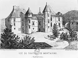 Montaigne wurde als Michel Eyquem[7] auf Schloss Montaigne geboren, das sein Urgroßvater Ramon Felipe Eyquem (1402–1478),[8] ein durch Handel mit Fisch, Wein und Indigo reich gewordener Kaufmann aus Bordeaux,[9] im Jahr 1477 samt der zugehörigen Grundherrschaft gekauft hatte. Ramon Felipe war seit dem Jahr 1444 mit Isabeau de Farraygues (1428–1508) verheiratet. Das Paar hatte zwei Söhne, Grimon und Perrin Eyquem, sowie die beiden Töchter Pélegrina und Audeta.[10] Ramon Felipe Eyquem erwarb am 10. Oktober 1477 ebenfalls das nach ihm benannte Château d’Yquem als Lehen der Erzbischöfe von Bordeaux; der Kaufpreis soll 900 Goldfranken (franc à pied) betragen haben.[11] Dieses Erbe wurde von Montaignes Großvater Grimon Eyquem (1450–1519), jurade de Bordeaux, weitergeführt.[12] Er war seit 1490 mit Jeanne du Fourn (um 1470–1519) verheiratet.[13][14]
