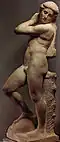 Die zwei Sklaven im Louvre sind junge männliche Figuren von gleichermaßen perfekter Ausführung, bis auf das Band auf der Brust des einen und am rechten Bein des anderen nackt. Der eine, mit der linken Hand an den Kopf erhoben und der rechten an die Brust gepresst, die Augen fast geschlossen, scheint den Qualen des Todes zu erliegen. Der andere, mit den Armen hinter dem Rücken, schaut nach oben, hoffnungslos kämpfend. Alle drei Figuren wurden zwischen 1513 und 1516 beendet.