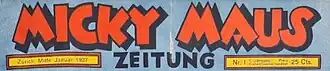 Als Micky-Maus-Zeitung erschien von Januar bis September 1937 im Micky-Maus-Verlag Bollmann der Zürcher Druckerei Jacques Bollmann AG das erste deutschsprachige Disney-Comicmagazin.[1] Die Herausgabe musste infolge der Weltwirtschaftskrise und der Lizenzbeschränkungen der Walt Disney Company im September 1937 sistiert werden.[2]