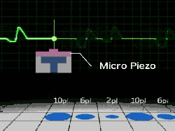 Bei einem Micro-Piezo-Druckkopf sitzt hinter den Farbdüsen ein Piezoelement. Dieses Piezo-Element besteht aus einem piezoelektrischen Material kombiniert mit einer Vibrationsplatte. Wird nun eine elektrische Spannung an das Piezoelement gelegt, so biegt sich das Element nach außen. Durch diesen Effekt entsteht ein Unterdruck, der dazu führt, dass Tinte aus der Tintenkammer in die Vorkammer gesaugt wird. Sobald die Tinte ausgestoßen werden soll, wird die Polung umgekehrt und das Piezoelement biegt sich sehr schnell in die entgegengesetzte Richtung. Dieser Effekt treibt die Tinte mit hoher Geschwindigkeit durch die Farbdüse.