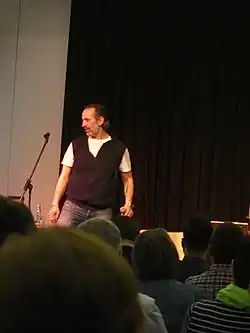 ![]() Kutlu Yurtseven (Microphone Mafia) bei einem Auftritt mit Esther und Joram Bejarano, April 2015 | |