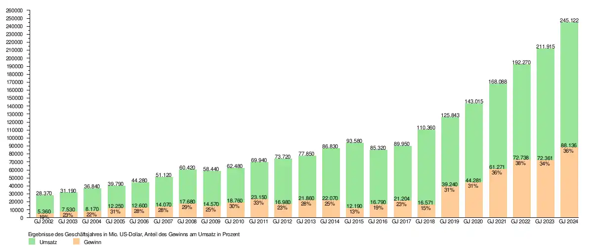 Mit einer Umsatzrendite zwischen 25 und 33 Prozent zwischen 2005 und 2014 zählte Microsoft nach der Jahrtausendwende zu den besonders profitablen Aktiengesellschaften weltweit.[5] Die extrem ungünstig verlaufene Übernahme der Handy-Sparte von Nokia im Frühjahr 2014[6] und die spätestens seit diesem Zeitpunkt einsetzende Flaute auf dem weltweiten Markt für Personal Computer[7] hat jedoch die Profitabilität zuletzt stark reduziert (Umsatzrenditen 2015 und 2016: 13 Prozent respektive 19,7 Prozent). Microsoft gehört regelmäßig nach der Marktkapitalisierung laut der Liste Financial Times Global 500 zu den teuersten Unternehmen der Welt. Im Januar 2024 hatte Microsoft Apple als wertvollstes Unternehmen nach Marktkapitalisierung[8] für kurze Zeit überholt, bevor der KI-Boom ausbrach.