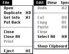 System-1-Menüs (Macintosh, englisch): zu erkennen ist ganz rechts (abgeschnitten) das Spezial-Menü.Bildschirmfoto von Windows 1.03 (deutsch) mit geöffnetem Menüpunkt „Spezial“