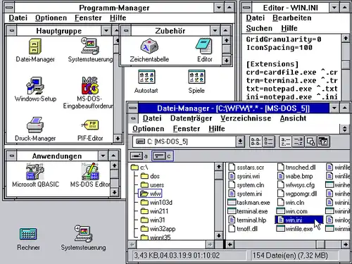 Microsoft Windows wurde als grafische Benutzeroberfläche für DOS-Rechner vorgestellt. DOS wurde für Systemzugriffe verwendet. Das änderte sich mit Windows 3.x allmählich. Zwischen Windows-Programmen war nur kooperatives Multitasking verfügbar. Mit Windows for Workgroups wurde eine Version mit integrierter Netzwerkfähigkeit veröffentlicht. Der Namenszusatz wurde ab Windows 95 und in allen Windows-NT-Versionen wieder fallen gelassen.