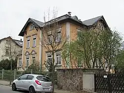 Die zweigeschossige, mit Einfriedung und Toreinfahrt denkmalgeschützte[1] Mietvilla von asymmetrischem Aufriss steht auf einem Bruchsteinsockel und hat ein abgeplattetes, schiefergedecktes Walmdach.