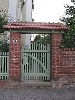 Die Einfriedung ist ein Lattenzaun zwischen Backsteinpfeilern mit Ziegelabdeckungen. Der Zugang erfolgt durch eine Gartenpforte mit gerader Verdachung. Am oberen Ende der Torpfeiler deutet eine Reihe vorstehender Steine ein Kapitell an, auf dem ein Holzgebälk ruht. Dieses trägt ein mit Turmbibern gedecktes, kleines Walmdach. Die streng rechteckige Form von Lattenzaun und Toranlage wird durch die geschweifte Oberkante sowie die nach oben gebogene Form der Diagonalversteifung des Lattentores gemildert.[2]
