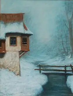 Frauenwohnhaus in den bosnischen Bergen (Kreide, um 1920), 48 cm × 63 cm.