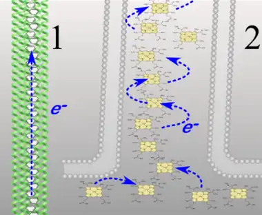 Die Nanodrähte von Bakterien der Gattung Shewanella haben einen grundsätzlich anderen Aufbau. Es handelt sich nicht um Pili, sondern um Ausstülpungen der Periplasmamembran, die eine Länge von bis zu 9 µm erreichen.[4] In ihnen sind Häm-Moleküle angereichert, und zwar die Cytochrome MtrC und OmcA.[5][6] Ihr Nachweis in der Äußeren Membran und der Verlust der Leitfähigkeit bei Mutanten mit MtrC und OmcA -Defekt[7] lässt vermuten, dass die Leitfähigkeit der Shewanella Nanodrähten auf diesen Cytochromen beruht.[8][9] Es wurde ein an Elektroden verifizierter Mechanismus vorgeschlagen, nach dem ein Elektronen-„Hopping“ (Hüpfen) zwischen den gelösten Cytochromen die Leitfähigkeit bewirkt[1][10] (siehe Abbildung). 2020 entwickelten Forscher mit Hilfe der leitfähigen mikrobiellen Nanodrähten von Geobacter sulfurreducens einen „Memristor“, der bei elektrischen Spannungen von weniger als 100 mV funktioniert. Der „Memory Transistor“ erlaubt den Betrieb durch Aktionspotenziale von natürlichen Neuronen und kann Biosensor-Signale lokal verarbeiten. Die Technologie könnte für Gehirn-inspiriertes Computing und direkte Kommunikation mit biologischen Gehirnzellen eingesetzt werden.[11][12]