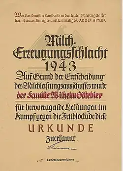 Am 6. März 1940 eröffnete das Reichsministerium für Ernährung und Landwirtschaft den ersten Wettbewerb im Rahmen der Milcherzeugungsschlacht. Diejenigen Bauern wurden mit Urkunden und Geldprämien ausgezeichnet, die höhere als die für das jeweilige Gebiet festgesetzten Milchmengen an die Molkereien ablieferten.