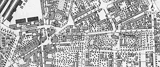 Ab 1838 erfolgte der Bau der neuen „Vorstadt vor dem Hinterthore“. Carl Lampe stellte dazu Teile seines Grundstücks zur Verfügung. Auf dem Gebiet der Milchinsel entstanden 1839 die Kreuzung von Mittelstraße (seit 1947 Hans-Poeche-Straße)[9] und Reudnitzer Straße[10] 1844 die Marienstraße (seit 1949 Chopinstraße)[11] sowie ein Teil der Egelstraße. Die Lampe-Villa erhielt die neue Anschrift Marienstraße 16; sie war nun ganz von Häusern und Gärten umgeben, die direkt an die Vororte Schönefeld und Reudnitz angrenzten.[12]