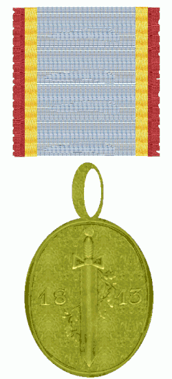 Die Medaille hat eine ovale Form und eine Größe von 23 mm × 28 mm. Die Vorderseite schmückt auf glattem Grund mittig ein senkrecht stehendes antikes Schwert, die Klinge nach unten. Um das Schwert windet sich ein Eichenlaubzweig[2] Rechts oben sind 4 Eichenlaubblätter und links unten 3 Eichenlaubblätter sichtbar. In Höhe der Mitte links und rechts neben der Klinge die Jahreszahl 18 13.