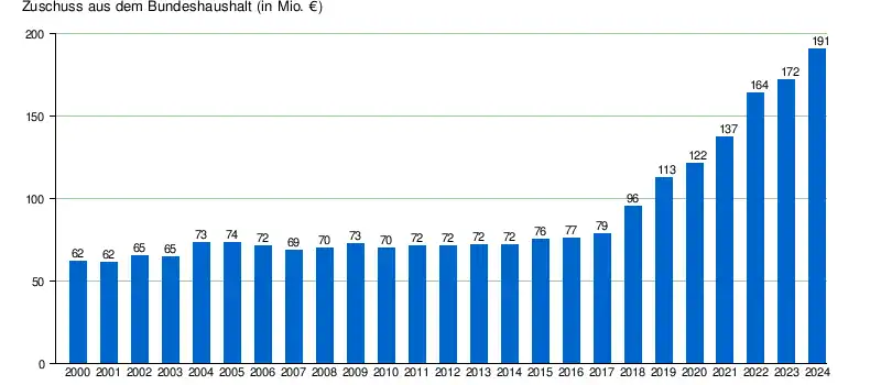Der Zuschuss aus dem Bundeshaushalt (Ist-Wert) betrug 191.019.753 Euro im Jahr 2024[49] und 172.164.175 Euro im Jahr 2023,[50] 164.052.845 Euro im Jahr 2022, 137.721.520 Euro im Jahr 2021[56] und 121.921.881 Euro im Jahr 2020[57] nach 113.251.923 Euro im Jahr 2019.[58] Der Etat hat sich innerhalb von fünf Jahren zwischen 2017 und 2022 mehr als verdoppelt.