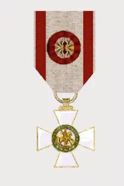 Das Ordensband war weiß mit roten Seitenstreifen und wurde auf der linken Brustseite getragen. Das Band der 1. Klasse war mit einer Rosette verziert.