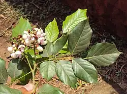Die unpaarig gefiederten und gestielten, unbehaarten Laubblätter mit fünf bis sieben[1] bzw. neun[2] Blättchen stehen wechselständig. An der Basis sind die kurz gestielten Blättchen abgerundet bis spitz, der Länge nach eiförmig bis verkehrt-eiförmig oder elliptisch, an der Spitze abgerundet bis bespitzt oder spitz bis zugespitzt und ganzrandig. Sie sind in der Jugend weich und glänzend weinrot und reifen im Laufe der Saison zu einem glänzenden, tiefen Grün mit ausgeprägten Adern an der Unterseite. Die kleinen Nebenblätter sind abfallend.[2] Der Baum ist immergrün, nur in einer kurzen Periode im Frühjahr unmittelbar vor dem Austrieb der neuen Blätter laubwerfend.[4]