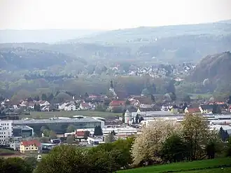 Blick vom Hahnen nach Südwesten über Mimbach, im Hintergrund erkennt man Teile von Blickweiler.