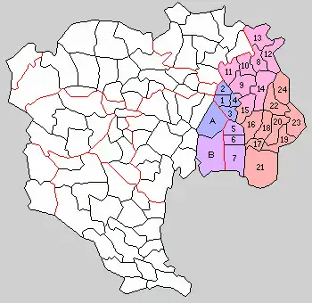 | Gemeindegliederung in Süd-Katsushika (Ziffern) in Tokio 1889, heutige Gemeinden in Flächenfarben Buchstaben: historisch zum Katsushika-gun gezählt, in der Hauptsache aber schon 1878 als -ku von Tokio vom -gun getrennt (-ku damals: ~Stadtkreise =meistens komplette Städte, z. B. Hiroshima-ku von Hiroshima, Yokohama-ku von Kanagawa, Akamagaseki-ku von Yamaguchi, bloß in den drei Stadtpräfekturen Tokio, Osaka und Kyōto kleinteiligere Gliederungen), 1889 unter Eingliederung weiterer vormoderner Dörfer aus (Süd-)Katsushika Stadtbezirke der neuen kreisfreien Stadt Tokio ![]() Anlass für mehrere Gemeindeteilungen 1914 war der geplante Bau des Arakawa-hōsuiro („Arakawa-Entwässerungskanal“=heutiger Unterlauf des Arakawa) | |