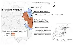 Am 12. März 2011 erklärte die japanische Zentralregierung als Reaktion und Gegenmaßnahme auf die Nuklearkatastrophe von Fukushima den nuklearen Notfall und ordnete die Evakuierung aller Gebiete im Umkreis von 20 km um das Kernkraftwerk Fukushima Daiichi (auch engl. restricted area / dt. „Sperrgebiet“ oder engl. mandatory evacuation zone / dt. „obligatorische Evakuierungszone“) oder mit hoher Strahlungsdosis an.[27][26][28] Es gab jedoch auch jenseits dieses 20-km-Radius viele andere Standorte mit hohen Strahlungswerten, da radioaktive Partikel über den Wind aus dem havarierten Kraftwerk fortgetragen wurden. Zu diesen Orten zählten Minamisōma sowie 10 weitere Dörfer und Städte, darunter Naraha, Tomioka, Kawauchi, Ōkuma, Futaba, Namie, Katsurao, Iitate, Tamura und Kawamata.