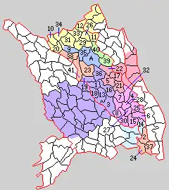 Städte (-machi), Dörfer (-mura) und Gemeindeverbände (chōson kumiai) im Kreis Süd-Saitama 1889, deren Nachfolger und unterstrichen das Jahr des Ausscheidens, sowie Gemeinden im 21. Jahrhundert in Flächenfarben: