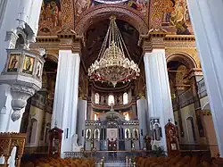 Entlang der Mittelachse des Hauptschiffes füllen drei riesige Kronleuchter aus Gold und Silber mit dem byzantinischen Doppeladler den Kirchenraum aus. Der mittlere Kronleuchter, aus purem Gold und in der Form einer Tiara gestaltet, hängt direkt unter der Kuppel und symbolisiert den Anspruch auf Weltherrschaft.