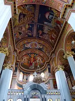 Die religiösen Darstellungen an den Wänden und in der Kuppel folgen genau den Prinzipien und Motiven der byzantinischen Ikonenmalerei. Die Ausmalung der Kirche mit Fresken wurde erst 1964 von Stelios Kartakis vollendet. Sie stellt Themen biblischen Inhalts dar: im Altarraum: Das Leben Jesu und Himmelfahrt, im Nordschiff: Karwoche, im Südschiff: Auferstehung und Pfingsten, in der Kuppel: Jesus als Weltenherrscher (Pantokrator), in der Apsis: thronende Mutter Gottes (Hodegetria) mit Jesuskind, darunter die Göttliche Messe (Kommunion).