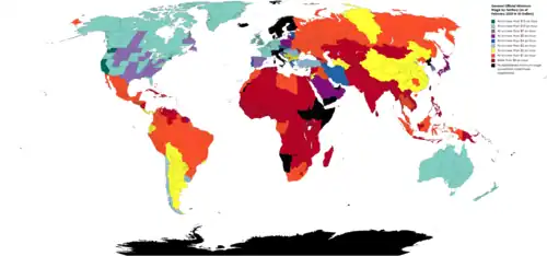 Eine 1970 von der Internationalen Arbeitsorganisation (ILO) beschlossene Absichtserklärung zur Einführung von Verfahren zur vertraglichen Festlegung von Mindestlöhnen[1][2] hatten zu Beginn des 21. Jahrhunderts 51 der 181 ILO-Mitgliedsstaaten ratifiziert.[3] Nach einer Statistik der ILO gibt es in über 90 % ihrer Mitgliedstaaten Mindestlöhne.[4]