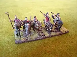 Ursprünglich wurden alle maßstabsgetreuen Modelle aus Metall hergestellt. Frühe Modelle, die für Miniatur-Kriegsspiele wie H.G. Wells Little Wars hergestellt wurden, waren hohl gegossen und aus Blei gefertigt. Bei der Herstellung dieser Modelle wurde nicht auf die Bemalung geachtet, obwohl sie bemalt werden konnten, um Streitkräfte und Armeen auf einen Blick unterscheiden zu können. Modelle aus Metall wurden noch viele Jahrzehnte lang hergestellt, wobei die Modelle von Jack Scruby in den 1950er Jahren für die Wiedergeburt des Tabletop-Hobbys verantwortlich waren,[2] die aus Metall hergestellt wurden. Diese wurden von Hand in Ton geformt und dann in eine Form gegossen, um Kopien anzufertigen.
