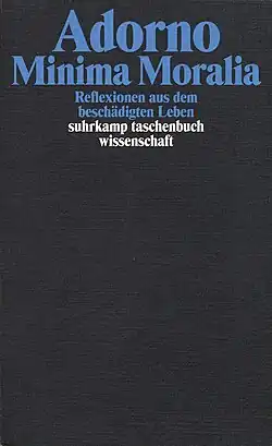 • Theodor W. Adorno: Minima Moralia. Reflexionen aus dem beschädigten Leben. Suhrkamp, Frankfurt am Main 2001, ISBN 3-518-41300-7, (Jubiläumsausgabe als Nachdruck der Erstausgabe)