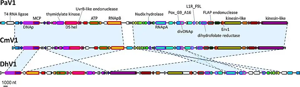 - Dikerogammarus haemobaphes virus 1 (DhV1) – infiziert den Kleinen Höckerflohkrebs (Dikerogammarus haemobaphes)[3] – Pontokaspis, invasiv im Vereinigten Königreich Großbritannien und Nordirland