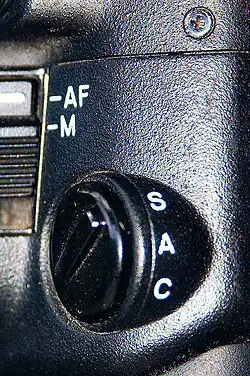Das AF-System der Kamera beherrscht drei Modi: einen statischen Speicherautofokus (AF-S aka „S“), einen kontinuierlich nachgeführten Autofokus (AF-C aka „C“) sowie eine Automatikfunktion (AF-A aka „A“), bei der die Kamera selbständig einen der beiden Basismodi auswählt. Der AF-Modus wird durch einen Dreiwegeschalter an der Vorderseite des Gehäuses gewählt, wo er mit der linken Hand auch ohne Blickkontakt umgeschaltet werden kann. Bei aktiviertem Eye-Start arbeitet die Kamera immer in AF-C und mit langsamer Fokussiergeschwindigkeit, solange der Auslöser noch nicht angedrückt wurde.