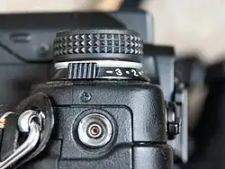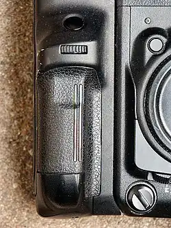 Neben Verschlusszeit und Blendenzahl werden auch die anderen Parameter der einzelnen Kamerafunktionen über die zwei Einstell- oder Wahlräder justiert. Das vordere Rad bedient man mit dem Zeige- oder Mittelfinger, das hintere mit dem Daumen der rechten Hand. Stützt man das Objektiv mit der linken Hand ab, können beide Räder bedient werden, ohne die Kamera vom Auge absetzen zu müssen; hält man die Kamera nur in der rechten Hand, kann ohne Übung oder Handschlaufe nur das vordere Einstellrad bedient werden, da Daumen und Handballen die Kamera stützen; dafür ist extra eine Daumenstütze vorgesehen.