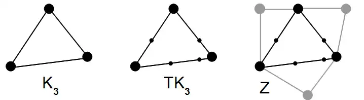 Links außen ist der vollständige Graph mit drei Knoten, mittig ein Unterteilungsgraph abgebildet. Der Unterteilungsgraph ist aber im Graphen enthalten, ist also topologischer Minor von .