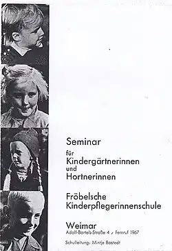 „Das Hauptgewicht der Kleinkinderpädagogik liegt in ihrer Einstellung zu Spiel und Arbeit beim kleinen Kind. Die grundlegenden Gedanken wurden hier von Friedrich Fröbel ausgesprochen, sind aber bis heut noch nicht genügend lebendig gemacht worden. Spiel und Arbeit sollen für das Kind Bildungsprozesse sein. Das Spiel als ein subjektiver Bildungsprozeß gemeint, d. h. das Kind soll im Spiel die in ihm liegenden Kräfte ohne jede Zusetzung und ohne jede Absicht auswirken und entwickeln. Das alleinige Ziel des Spieles liegt pädagogisch gesehen in der Entfaltung der kindlichen Kräfte.“[8]