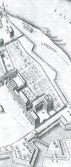 Die Gegend um den jetzigen Mirabellplatz lag bis kurz nach Errichtung der Schlossanlage Mirabell 1607 außerhalb der Stadtmauer, die entlang der heutigen Paris-Lodron-Straße verlief und in Resten noch vorhanden ist. Das Gelände, das umliegend als Burgfeld bezeichnet wurde, war in zahlreiche Privatgrundstücke geteilt, die vielfach als Obst- und Gemüsegärten genutzt wurden und auf denen auch Gebäude standen.[4] Erst mit dem Bau der Lodronschen Stadtbefestigung ab 1620 kam das Gebiet um das Schloss in einen wehrgeschützten Bereich, um es im Dreißigjährigen Krieg gemeinsam mit dem Rest der Stadt vor Feindeinfall zu bewahren. Unmittelbar nördlich des heutigen Platzes entstanden eine Ummauerung und die Bollwerke und Bastionen des rechtsufrigen Stadtbereichs, die von der Salzach bis zum Kapuzinerberg verliefen und nördlich bis östlich des heutigen Mirabellplatzes einen 90-Grad-Bogen beschrieben. Der Verlauf ist heute noch an den Straßenzügen von Franz-Josef-Straße und Auerspergstraße nachzuvollziehen. Das für die Wehranlage benötigte Areal, eine Fläche bestehend aus „8 Häuser, 1 Lusthäuschen, 19 Städel und Ställe (kleinere Nebengebäude ungerechnet), 15 Gärten und etwa 30 andere Grundstücke“, war den privaten Besitzern um insgesamt etwa 40.000 Gulden abgelöst worden.[4] Die gesamte Befestigungsanlage wurde 1862, da nicht mehr der fortgeschrittenen Wehrtechnik entsprechend, abgetragen. Die Steine wurden zur Aufschüttung der Wehrgräben und für die Regulierung der Salzach etwa im Bereich zwischen Staatsbrücke und Eisenbahnbrücke verwendet.