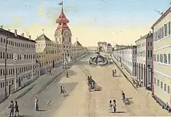 Um die Wende vom 18. zum 19. Jahrhundert bot der Mirabellplatz mit seiner Abgeschlossenheit innerhalb von teils repräsentativen Bauwerken, mit den beiden Torzugängen (Mirabelltor im Norden, Lodrontor im Süden) und mit der Pferdeschwemme in der Nordhälfte eine besondere Ästhetik. Dabei war das Schloss Mirabell mit dem damals noch existierenden Turm an der platzseitigen Ostfassade ein Blickfang. Der Platz wurde zu dieser Zeit eingesäumt von der Schlosswache und dem Mirabelltor im Norden, dem Hofstall, dem älteren städtischen Schrannengebäude und dem Lodronschen Sekundogeniturpalast im Osten, dem Lodrontor und dem Primogeniturpalast im Süden sowie im Westen mit dem Schloss und einem schräg zwischen Primogeniturpalast und Schloss befindlichen Gebäude für den Stadtobersten.[6] Viel dieser Schönheit ging durch die Zerstörungen beim großen Stadtbrand am 30. April 1818 verloren. Doch noch in einer Stadtbeschreibung von 1824 wurde der Mirabellplatz als „einer der schönsten Plätze der Stadt“ beschrieben.[18]