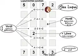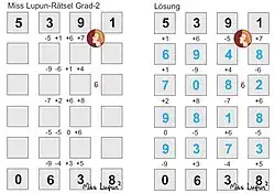 Miss Lupun ist ein Zahlen- und Logikrätsel. Der Name „Miss Lupun“ ist ein Anagramm von „Plus Minus“.