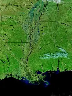 Im Süden des Bundesstaates Louisiana mündet der Strom in einem weitläufigen Delta in den Golf von Mexiko. Der längste Mündungsarm ist der Atchafalaya River, der rund 500 km vor der Hauptmündung vom Mississippi abzweigt und selbst ein Delta ausbildet. Das United States Army Corps of Engineers begrenzt mit der Old River Control Structure die Wassermenge, die vom Hauptarm des Flusses in den Atchafalaya abfließen kann, auf rund 30 %, im Hochwasserfall auf knapp 50 %. Flussabwärts von New Orleans hat sich im Laufe der Zeit aufgrund der großen Sedimentfracht des Flusses und dem geringen Gezeitenhub des Golfs von Mexiko ein fingerförmiges, sogenanntes Vogelfußdelta geformt, welches fünf Hauptarme besitzt. Es ist mit 28.600 km² eines der größten Mündungsdeltas weltweit. Die Menge an angelieferter Flussfracht beträgt im Mississippi-Delta täglich 1 bis 1,5 Millionen Tonnen an Sediment.[16] Das durch regelmäßige Überschwemmungen geschaffene flache Schwemmland ist sehr fruchtbar. Durch die Zufuhr an nährstoffreichem Süßwasser und das im Wechsel der Gezeiten einströmende salzige Ozeanwasser ergeben sich hohe Raten der Primärproduktion (Algen, Phytoplankton) und zunehmende Anteile organischen Bodenmaterials. Die hohe Artenvielfalt in den Gewässern begünstigt die Fischerei. Sie erbringt rund eine Million Tonnen Fisch pro Jahr und ist damit die bedeutendste in den USA. Hauptanbaufrüchte der Landwirtschaft sind Reis, Baumwolle, Zuckerrohr und Sojabohnen. Die zwei Hauptprobleme im Gebiet des Mississippi-Deltas sind der Verlust an Feuchtgebieten durch den Anstieg des Meeresspiegels und die Eutrophierung.