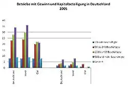 Mitarbeiter-Kapitalbeteiligungen spielen in Deutschland vor allem in größeren Unternehmen mit über 500 Mitarbeitern eine Rolle.[1] Ostdeutsche Unternehmen nutzen Beteiligungsmodelle in geringerem Umfang als Unternehmen aus dem Westen.[1]