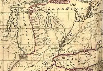 - nördlich des Lake Huron: „MESSESAGUES - Subdued by the Iroquois and now united with them making the 8th Nation in that League.“ (bezieht sich auf das Volk der Mississaugas)