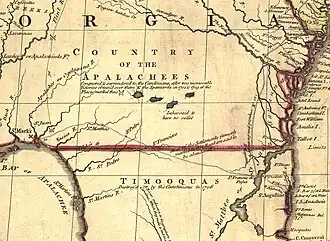 - Süd-Georgia: „COUNTRY OF THE APALACHEES - Conquered & surrendered to the Carolinians, after two memorable Victories obtain'd over them & the Spaniards in 1702 & 1703 at the Places marked thus [crossed-swords]“ (bezieht sich auf das Volk der Apalachee)