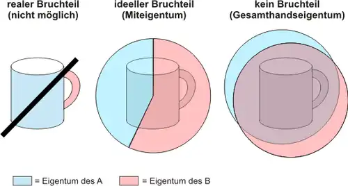 Eine andere Art des Miteigentums ist das Gesamthandseigentum der BGB-Gesellschafter nach § 719 BGB, der Ehegatten in der Gütergemeinschaft nach § 1419 BGB und der Miterben nach § 2033 Abs. 2 BGB.[5] Jeder ist hierbei Eigentümer der ganzen Sache, weil es ideelle Bruchteile nicht gibt.