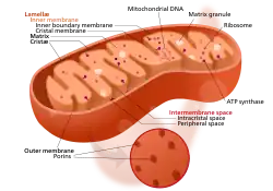 Während im Menschen über 1500 Proteine im Mitochondrium vorkommen (etwa 1000 in Hefen), sind nur 13 Proteine in der mtDNA codiert (8 in Hefen), während die übrigen Proteine über Signalsequenzen aus dem Zytosol über Tom und Tim importiert werden oder von Ribosomen im Zytosol erzeugt werden, die mit der äußeren mitochondrialen Membran verbunden sind.[3][8][9][10] Alle mitochondrial codierten Proteine sind an der Elektronentransportkette der oxidativen Phosphorylierung beteiligt.[11][6] Vier der fünf Proteinkomplexe daraus (I, III, IV, V) haben sowohl zytosolisch erzeugte als auch mitochondrial erzeugte Proteine.[12]