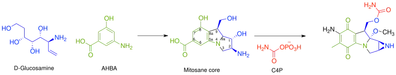Die Biosynthese in den beiden Streptomyces-Arten geht über drei Bausteine 3-Amino-5-hydroxybenzoesäure (AHBA), D-Glucosamin und Carbamoylphosphat.[23][24]