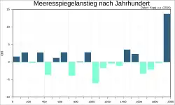 Der Meeresspiegel schwankte in den letzten zweitausend Jahren um etwa ± 8 cm. Er stieg bis etwa zum Jahr 700 an, von 1000 bis 1400 sank er etwas, einhergehend mit einer globalen Abkühlung von ca. 0,2 °C über diesen Zeitraum. Erst im 19. Jahrhundert begann der Meeresspiegel wieder zu steigen, wobei der Anstieg deutlich schneller verläuft als während des Mittelalters.[35]
