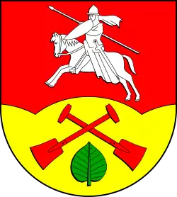 Blasonierung: „Über einem leicht abgeflachten goldenen Dreiberg, darin zwei gekreuzte rote Torfspaten über einem grünen Buchenblatt, in Rot auf silbernem, rechtshin springendem Pferd ein silberner Gerüsteter, in der Linken einen vorgehaltenen silbernen Schild, in der Rechten eine silberne Lanze haltend.“[8]